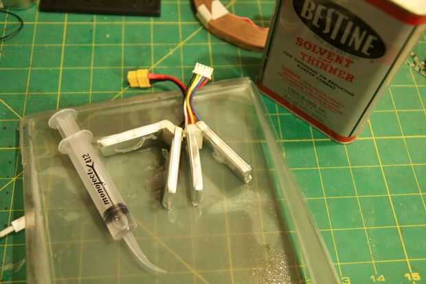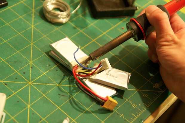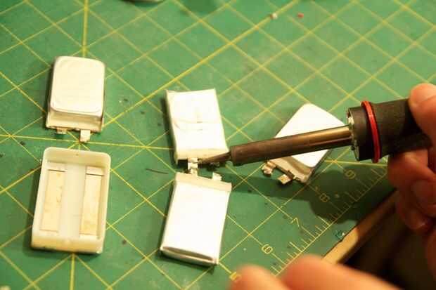 Los paquetes de baterías que pedimos son realmente cuatro individuales 3.7V baterías enlazados en serie para crear un 14.8V pack. Estos se pegan con pegamento, por lo que es más fácil de usar un solvente como alcohol para frotar para facilitar su separación. Una vez que los paquetes sin pegado, utilice un soldador para sacar todos los cables que sobresalen de los paquetes, ser cuidadoso no pueda causar ningún cortos! Estos son de alto voltaje y puede causar chispas brillantes que te choque o provocar un incendio! ¡¡Ten cuidado!! Una vez que haya tomado de todos los cables, utiliza tijeras o cortador para cortar las pestañas manteniendo las células juntas, asegúrese de cortar en el medio para asegurar que haya suficiente ficha para soldar a.
