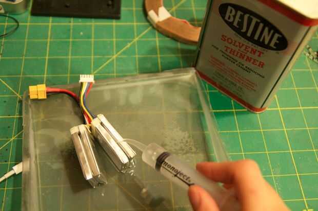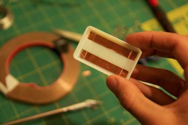 Colocar la cinta de cobre entre los imanes. Puesto que solamente un lado de la cinta es conductora por el adhesivo en la parte posterior, deberás plegar los extremos para que lo cobre sin el pegamento está en contacto con los imanes. Para mantener la cinta, aplicar epoxi a la parte superior de la cinta y el imán. Verificar que la resistencia entre los dos imanes no es demasiado alta (< 10 ohmios). Después de esto, añadir cinta de cobre a la parte posterior de la LiPo; alineados para que estén en contacto con las tiras en el recinto. La soldadura de la cinta a los terminales de alimentación protegida del PCM (etiquetados P + y P-).