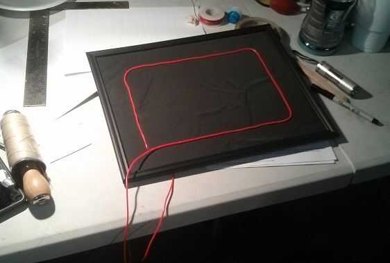 Atamos EL alambre a nuestro marco de coser a la base de cartón. Si usas un respaldo duro puede usar grapas o pegamento para fijar el cable. Asegúrese de dejar muy flojo en el extremo del conector al enchufe de la electrónica.