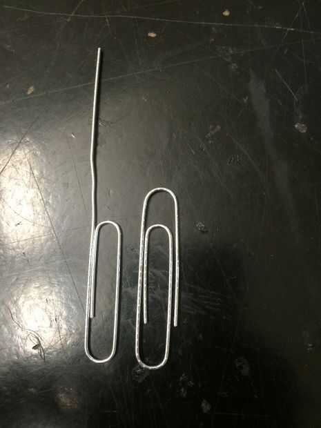 Doble dos clips de papel como se muestra en pasos de 10-14. Puede que desee utilizar los alicates para doblar los clips de papel más fácil, sin embargo esto no es necesario.