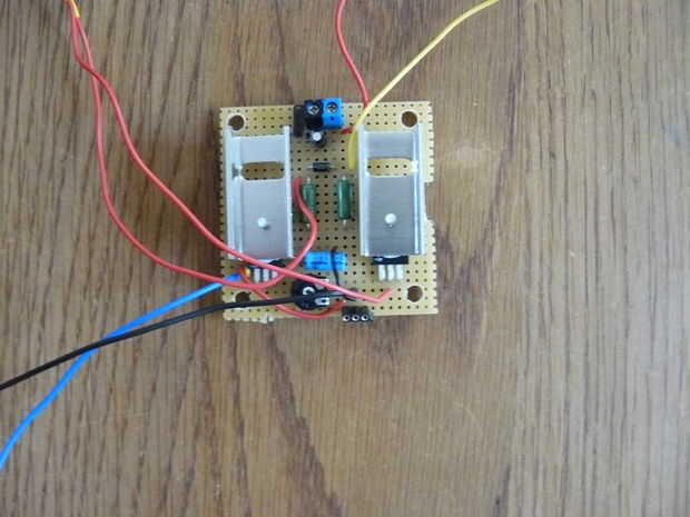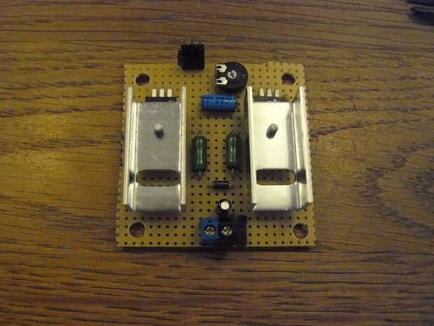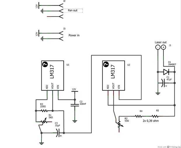 He incluido el controlador de láser que estoy usando. Este controlador de láser utiliza 2 de LM317 para regular el voltaje y la corriente. Puede haber mejores formas de construir un controlador de láser, pero así funciona, es barato y totalmente ajustable (voltaje y amperios). Este controlador de láser doble de LM317 tiene una entrada de 12 voltios y es capaz de suministrar 1, 5A a 2V (totalmente regulada) por largos períodos de tiempo. La caída de tensión es de 10V, así que si usted necesita más de 2V, necesita una mayor tensión de alimentación. Para este controlador de láser se necesita: