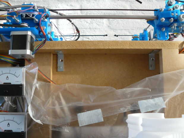 A los lados de la tolva, debe haber algunos pequeños pedazos de madera para mantener el dentro de polvo contenida la superficie de construcción. Estas barreras pequeñas sólo tienen que ser varios milímetros de alto. Mis barreras son demasiado lejos aparte, necesitan ser más estrecho (más cerca de la tolva).