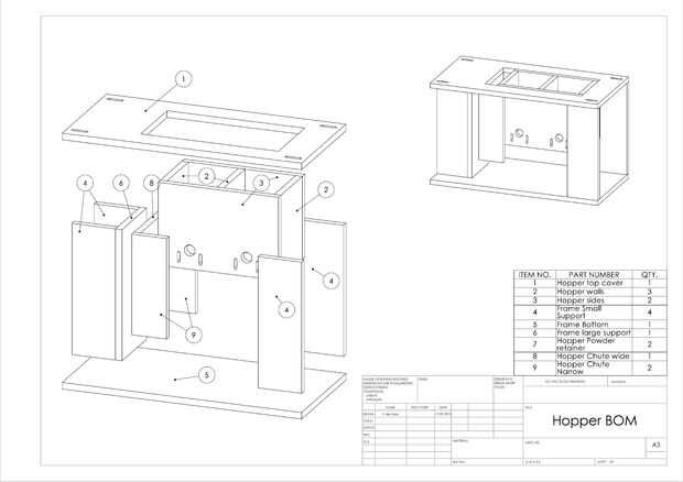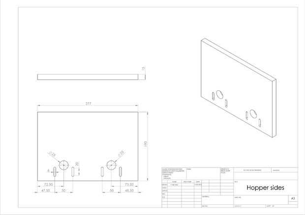 La tolva es la parte más complicada, no sólo porque tiene más agujeros, sino también porque necesita ser la más exacta. Cuando se colocan juntos, usted necesita tomar cuidado adicional para hacer las esquinas como perpendicular y las paredes opuestas tan paralelo como sea posible. Hay una forma sencilla de hacerlo: medir, medir y medir más. Entonces prueba de ajuste y luego medir más. Si esta parte está sesgada, o se atascará la tolva o fuga, ambos son realmente malos.