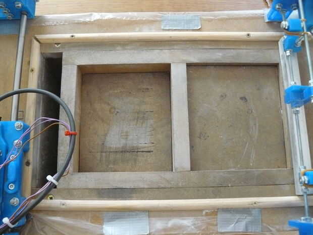 El marco se hace del MDF de 15mm. MDF es fuerte, barato, fácil de trabajar y no deforma mucho. Por lo tanto es el material ideal para hacer que una impresora de código abierto. Todas las piezas de madera sólo requieren los agujeros y cortes sencillos.