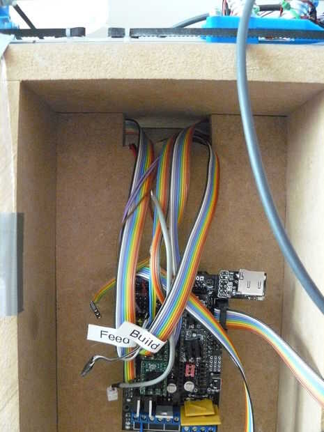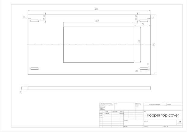 En la tapa de la tolva hay un gran agujero rectangular (realmente no puedes perdértela) donde se une la tolva. Trate de hacerlo con un espacio lo menos posible entre la tolva y la parte superior. Cuanto mayor sea la brecha, la impresora saldrá material. La bandeja recoge la mayor parte del material pero deja un tremendo lío.