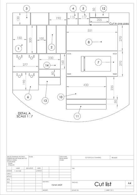 Algunas piezas deben ser iguales en tamaño. Esto se puede hacer cortando un pase, les corte la misma longitud. Hay dos cortes que tiene que ser exacta. El corte más importante se menciona en el dibujo, el que marcó en la lista de corte en las fotos anteriores.