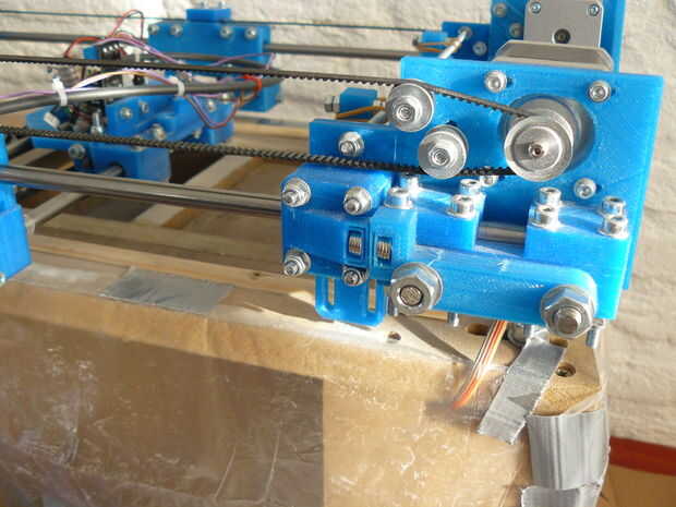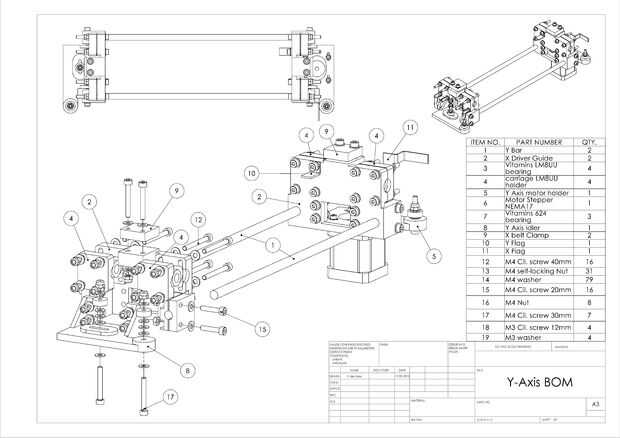 El eje y tiene una parte que requiere cierta precaución. Las barras lisas se sujetan por la guía del controlador de X. Los orificios de la guía del controlador probablemente imprimirá demasiado pequeño. Para hacer estos agujeros a la medida, primero Instale los tornillos que bloquee el vástago sin la flexión de la abrazadera. Luego cuidadosamente perforar con una broca de M8 y los agujeros de archivo hasta las varillas lisas sin interferencia.