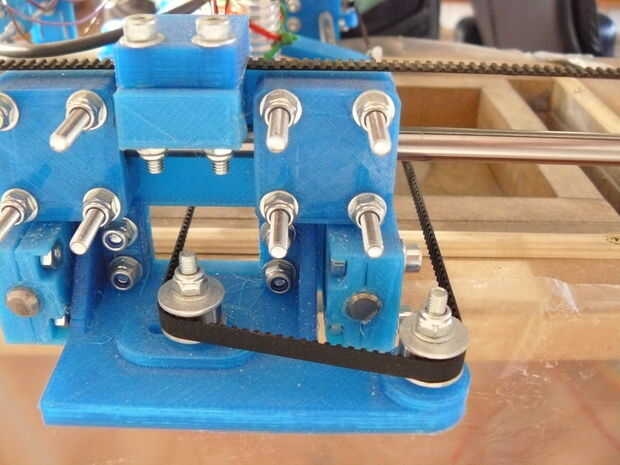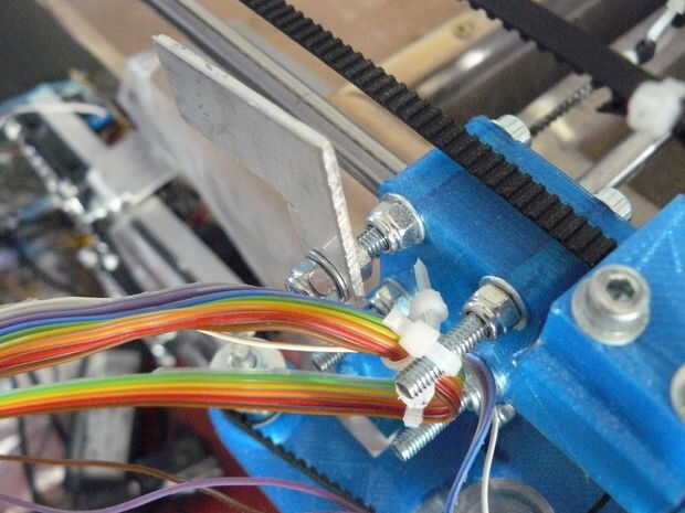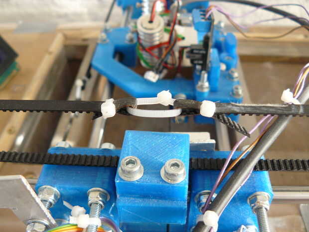 A continuación necesitará instalar las correas dentadas. Para el eje x, sujete la correa en el centro con las abrazaderas de correa. Luego uso corbata rips conjunta ambos extremos juntos y tensión de la correa. El eje y tiene dos extremos conectados al portador. Corté mi cinturón en reducir a la mitad y se unió a ellos con corbata desgarra así que podría tensión de les, pero también puede tensar la correa en el portador.