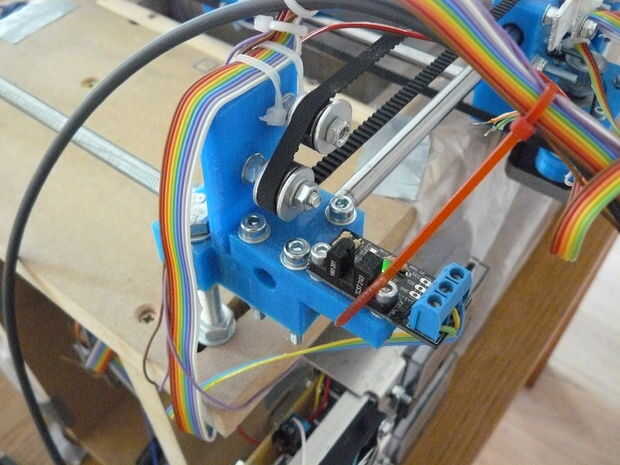 La grúa completa se une al chasis con cuatro pernos de M8. Estos caben en las ranuras en la parte superior. En este punto necesitará ajustar el pórtico por lo que es paralelo a la buildbox. Después de esto los ajustes deben hacerse para el depositante así que apenas hace contacto con la tolva.