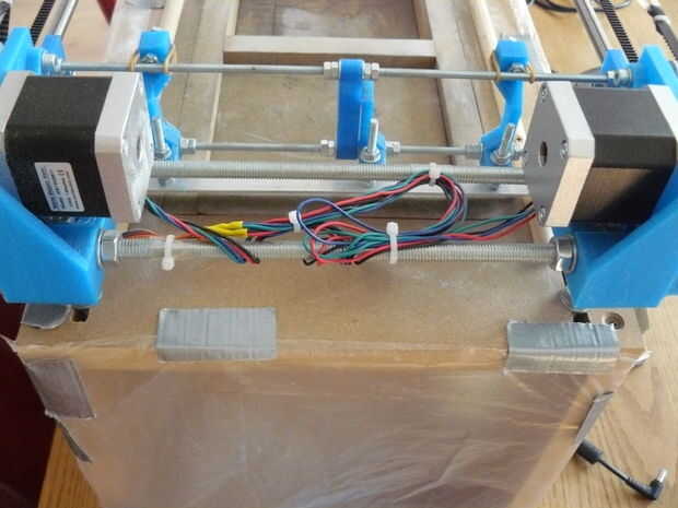 Hay 5 motores para instalar en esta impresora. Dos para el eje X, eje de la Y una, para el pistón de construcción y para el pistón de alimentación. Los motores de X tienen que cablearse como grupo, mientras que ambos motores van en dirección opuesta. Esto se hace conectando los cables del motor en reversa: 1A, 2B, 1B, 2A, 2A a 1B y 2B a 1A. Todos los motores no requieren ningún trabajo adicional adjuntarlos.