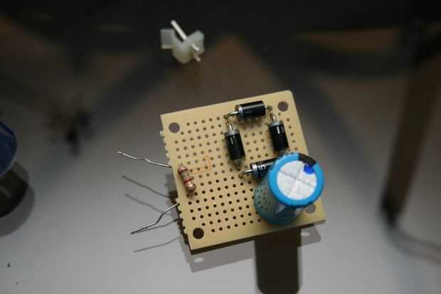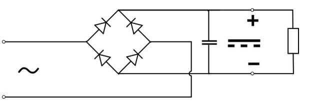 La electricidad fluye de una corriente eléctrica en los dos cables del transformador (la polaridad no importa, sólo asegúrese de que sabe usted de qué lado del transformador es la entrada y cual es la salida). Entonces, convertido de 120VAC a 13.5VAC, fluye a través de un circuito rectificador de puente con el condensador (véase la segunda imagen, cortesía de Wikipedia). El puente rectificador cambia la tensión en una tensión continua pulsante con un + y - y el condensador (atado con alambre como se muestra, asegúrese de que cable el + a + y el - a-!!!!!!) filtra el flujo de corriente a suavizar los impulsos en una constante de la electricidad. Desde aquí, el cable negativo va a diente medio del primer interruptor. Uno de los otros dientes se conecta la pata media de los otros dos interruptores, así como un LED con un resistor (resistencia variará dependiendo de tu transformador). Este LED se conecta directamente a la + conductor del condensador, haciendo un circuito.
