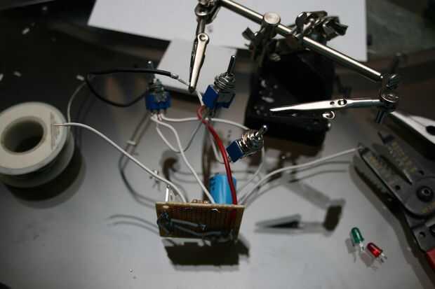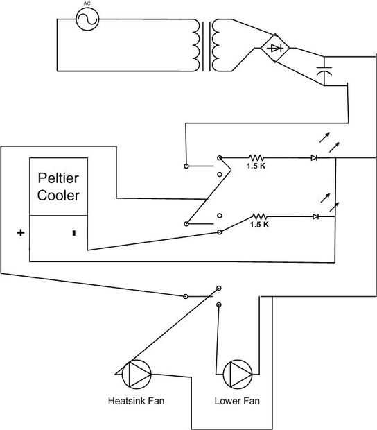 Hacia el segundo interruptor. Alambre de una de las puntas exteriores del interruptor al - conductor de la unidad Peltier y alambre el + conducir directamente a la + conductor del condensador. Este mismo diente del alambre al otro LED y resistencia (asegúrate de que tienes la polaridad correcta en el LED: el lado dentado o plano es generalmente negativo). Luego de alambre el + cable del LED, usted adivinado, la + conductor del condensador. El diente del centro de este interruptor debe conectarse al interruptor de primera.