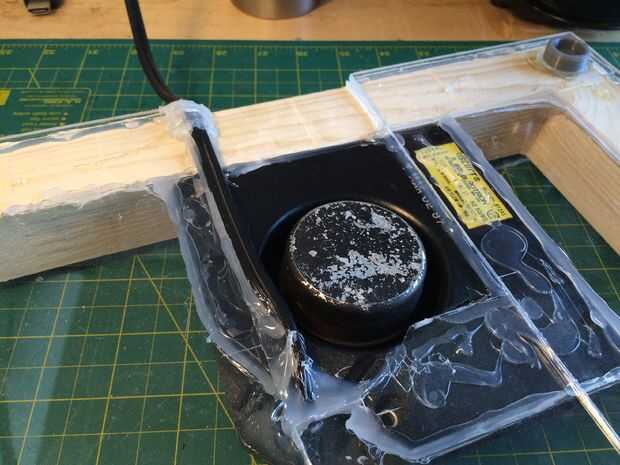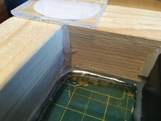 A continuación, cortar el plexi para hacer espacio para el ventilador. El ventilador que estoy usando es una galleta, y tiene una 90' diferencia entre la entrada y salida, en lugar de su ventilador de computadora típico que es directamente a través de. Que necesitaba para asegurarse de que tenía autorización porque parte del rotor sobresale por debajo de la base de la estructura. Me ajustaron el plexiglás en su lugar y entonces, después de secado, había montado ventilador con pegamento caliente.