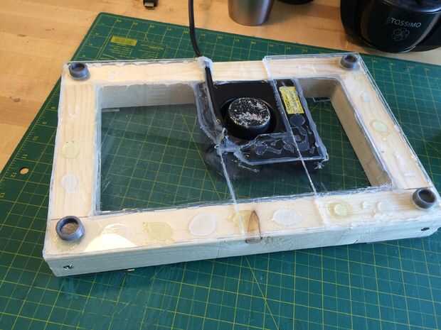 He añadido algunas bandas de plexi a la parte superior para permitir más espacio para el aire se mueva y pequeños pies de pegamento caliente para la parte inferior. Después reemplacé los pies con más ancho y más cortos 3d impresos unos, que ajustaron en la parte inferior de la plexi.