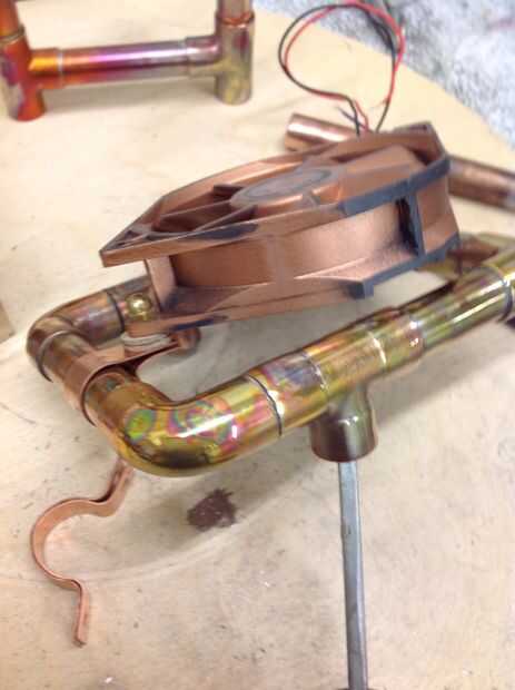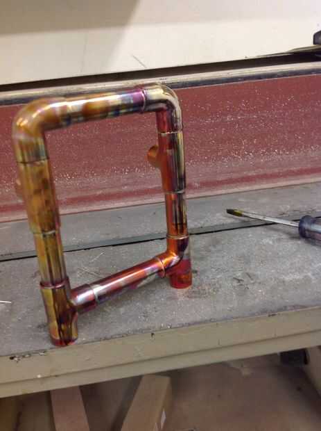 La estructura es de cobre de 1/2", lo único que yo diría sobre lo que es, cortar todo el tubo a la longitud exacta, esto hace que conseguir cuadrado un poco más fácil. También ayudaría a usar una plantilla de algún tipo, mina de mano libre y está un poco fuera de escuadra. Después de soldar vuelve a calentar para obtener los colores en el cobre.