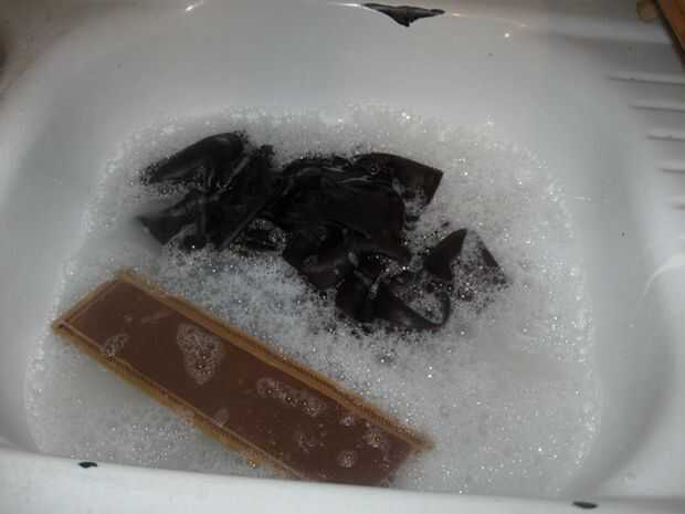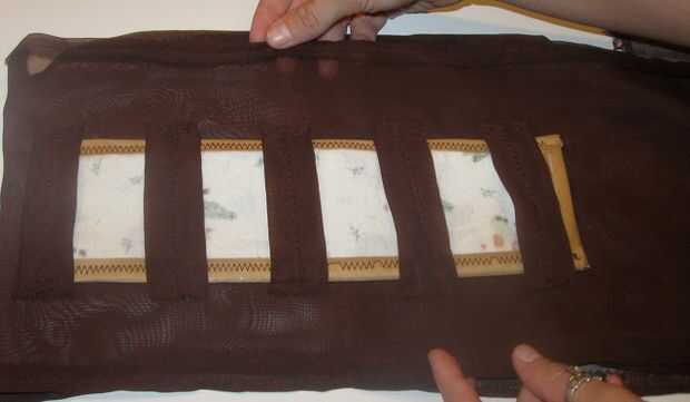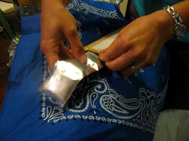 Se congelan las tiras de hielo. Cuando las piezas estén secas y se congelan las tiras de hielo, se pueden agregar las tiras de bolsa de hielo. Si el método 2 (paso 8) se utilizó para la fijación de la bolsa de hielo, deslice la bolsa debajo de las bandas de tela con la tela del tono de la piel hacia abajo, hacia la bufanda. Deslice una de las tiras de bolsa de hielo en la bolsa de hielo de la pieza.