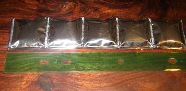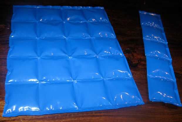 Comenzar usando tijeras para cortar la hoja del cubo de hielo en las tiras que son aproximadamente 10 "× 2" (para mí, este fue 1 cubo por 5 cubos). Ten mucho cuidado no a nick los paquetes de agua. Después del corte, prueba cada paquete del agua por fugas apretando suavemente. Si uno de los paquetes de fugas, la tira es inservible para este proyecto (los cubitos restantes de la banda pueden todavía congelados y utilizarse como hielo).