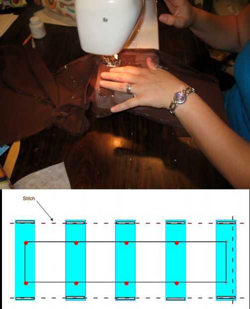 Cuando el pegamento esté completamente seco, coser ambos extremos cortos (donde pegados) de cada banda. Para una de las bandas en el borde de la región unir, coser longitudinalmente hacia abajo el borde exterior de la banda para crear un bolsillo (ver imágenes de visual).