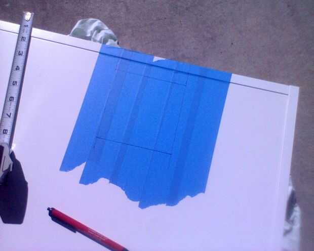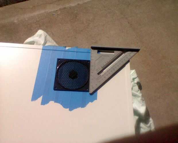 Una vez que determinado aproximadamente donde mis fans van a estar, cubrió el área en el interior y exterior con cinta de pintor, puede usar cinta adhesiva. Fue así que pude dibujar donde cortar y evitar demasiado astillado de la superficie del laminado.