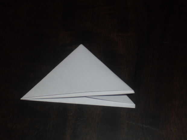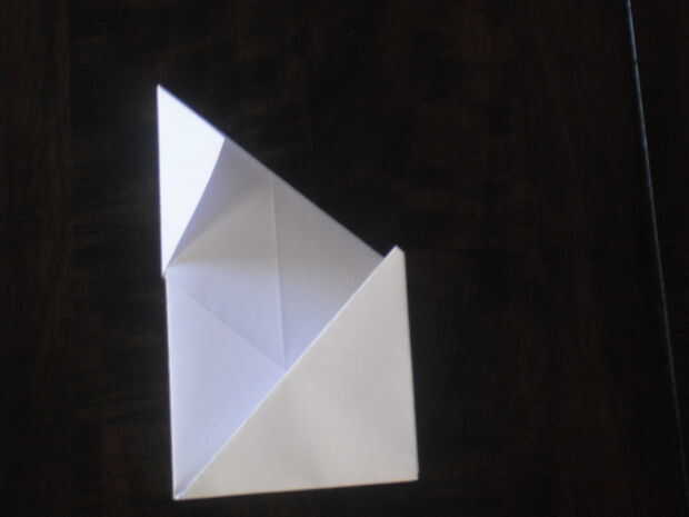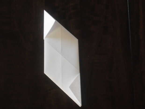 Después de voltearla, remeter las esquinas que forma un rombo y se ve como eso. Una vez que hayas hecho esto dobla la esquina superior e inferior hasta la figura entera forma un cuadrado. Luego doblar esa plaza por la mitad en el pliegue para que quede como un triángulo