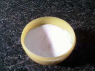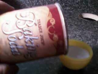 Lugar siguiente de la parte smmaller del huevo hacia arriba (que no has usado). Llenar hasta la mitad con el bicarbonato de sodio. Después se rellena la mitad pat hacia abajo.