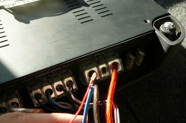 Queremos quitar el cable remoto azul en su lugar. Esto permitirá que el ventilador y cierre con el ampli. Tuerza el alambre de red(positive) del ventilador con el cable remoto azul y vuelva a colocarla en su amplificador.