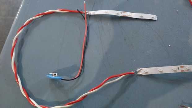 Generalmente el pad de soldadura adecuado es el terminal positivo y el izquierdo es la terminal negativa o tierra. Quieres soldar el polo positivo de una tira de led para el terminal positivo de la otra y el negativo de una tira a lo negativo de la otra. La longitud del cable sería algo entre 10-15cms dependiendo de su tamaño del zapato y la colocación de LEDs
