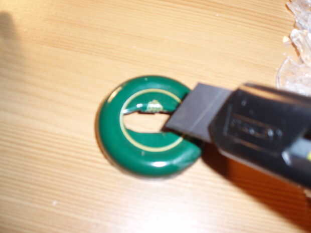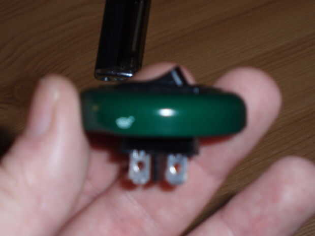 Primero, corte un agujero en la parte superior de la tapa del mismo tamaño que el interruptor de eje de balancín. Era lo suficientemente delgada como para que yo use un cuchillo, pero puede que necesite utilizar una Dremel. A continuación inserte el interruptor.