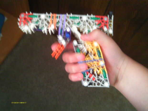 Verdadero disparo un tiro principiantes KVG pistola. Este es mi primer arma y instructable así que por favor no comentarios ásperos.Paso 1: mango Esto es muy fácil todo lo que haces es agarrar algunos conectores verdes y 2 barras de color amarillo y
