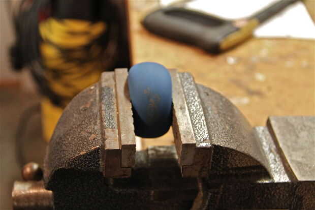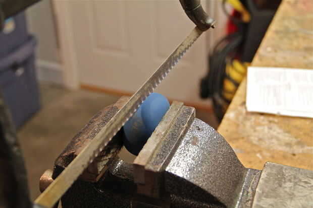 Colocar la bola en el vicio en una posición que usted será capaz de cortar a lo largo de la costura de la bola. Apriete el tornillo hasta que la bola está cerca de la mitad de su diámetro original. Empezar a cortar lentamente hasta que se rompe la superficie de la bola, luego cortar más rápido será mucho más fácil. Después de atravesar todo el camino, lave las mitades de la bola, dentro y fuera, para eliminar el polvo.