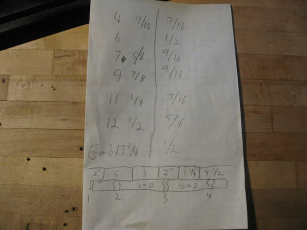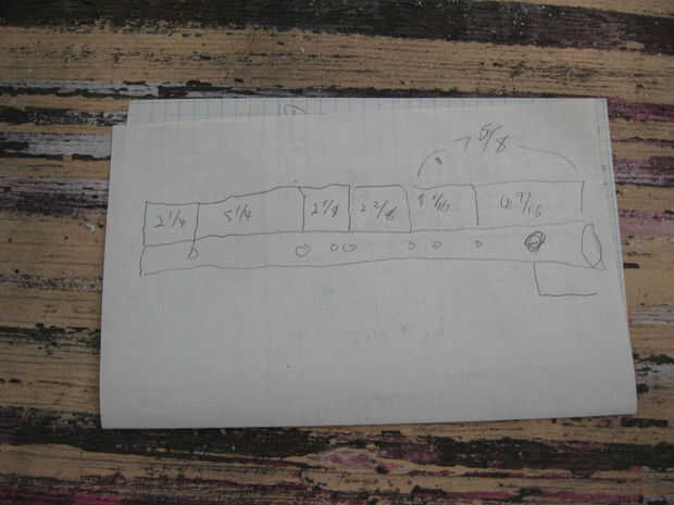 Usé Flutomat para determinar las dimensiones adecuadas para una flauta con una clave de pentatónica menor en E4. La distancia más larga dada es la distancia desde el extremo abierto de la flauta hasta el agujero de la boca, o el embouche. Terminé con 17 3/4". Decidí ir con 20" total. Hice un dibujo con todas las distancias marcadas hacia abajo para facilitar la referencia más adelante.