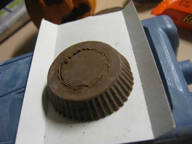 No ir demasiado profundo. Grabado a través el chocolate primero porque era algo difícil de estar en el icepack. Una vez con el chocolate puede quitar el corte del centro.