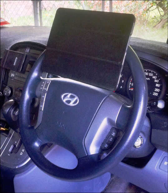 -Hacer seguro de que el cuerpo de la tableta cuelga claro de su cubierta de airbag en el volante si estacionas en lugares donde sea posible choque frontal. También considerar tener la aleta del doblez en la parte superior si se trata de una preocupación.