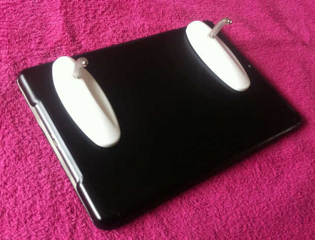Utilice las instrucciones del fabricante en el paquete de gancho y fije sus ganchos en la parte posterior de la caja (el caso no la tableta me {^_^}) como se describe a continuación. Esto generalmente es más fácil con la tablet en el caso ya que soporta la parte posterior del caso mientras se presiona los ganchos.