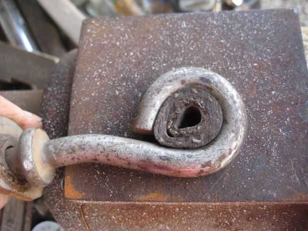 Tenemos que el gran agujero en el perno de ojo en un agujero pequeño. Encontré algunos tubería vieja en dos tamaños diferentes pero podría usar eso o un trozo de manguera de jardín o esperar a que una porción de la bola de golf arena y llenar el agujero. En el anterior utilicé un vicio para empujar el las rodajas de la manguera en la armella. Puede hacerlo con alicates, martillo o lo que sea.