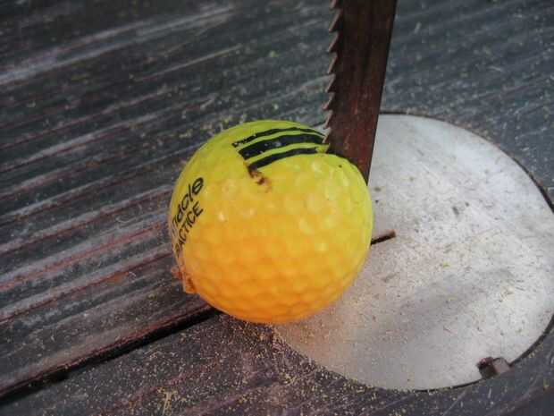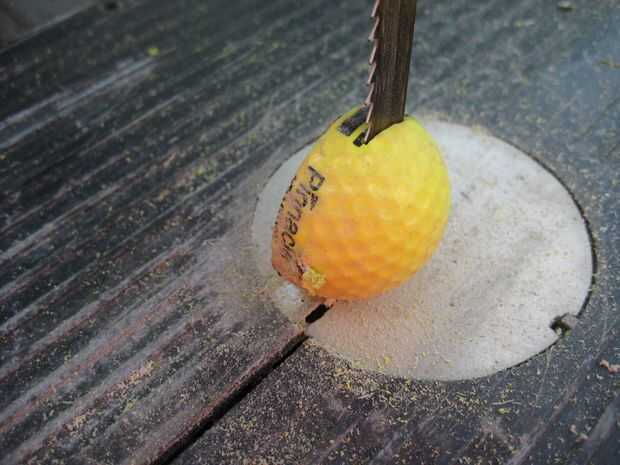 Usé una sierra para cortar la rebanada de la pelota de golf. SER cuidadoso, los dedos están realmente cerca de la hoja de sierra. Si no tienes una sierra o caladora Sierra, extreme las precauciones. No trate de cortar la bola en una sierra circular o sierra de mesa. Encontrar un amigo o un vecino con una sierra de banda.