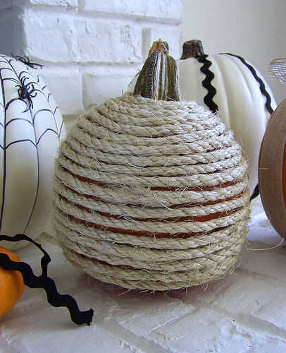Cinta cable y yute sisal son dos de mis artículos favoritos astutos... son baratos y siempre añadir gran textura natural. Puede pegar las tiras de yute en forma de banda alrededor de la calabaza. o envolver completamente con la cuerda del sisal.