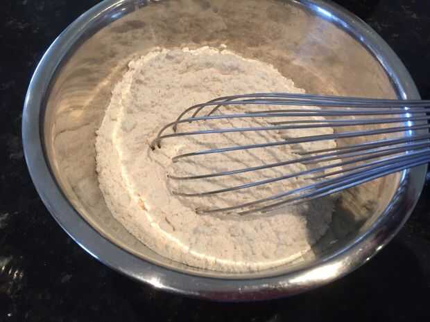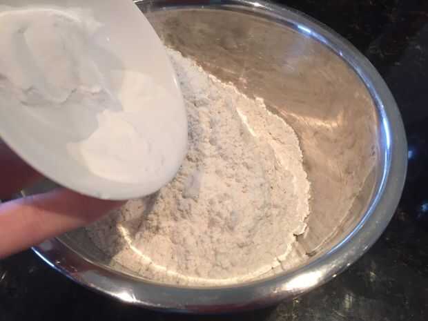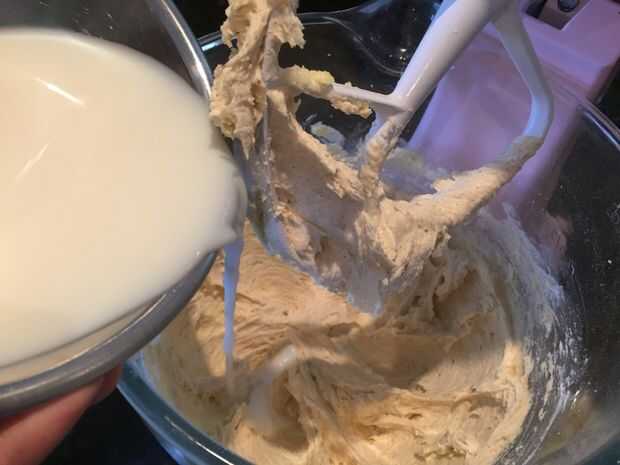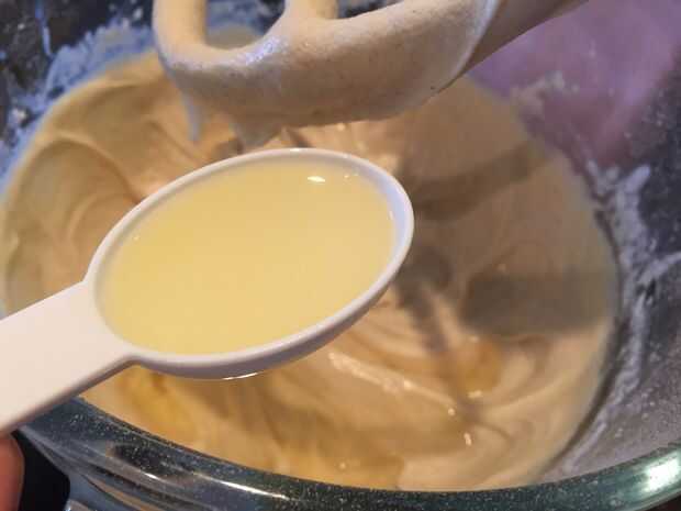 Añadir el polvo de hornear a la harina y batir juntos para deshacerse de algún tumor y luego añadir 1/3 de la mezcla de harina a la mezcla de mantequilla y batir juntos. Luego agregar 1/3 de la leche y continuar a batir la mezcla. repetir agregando 1/3 de la mezcla de harina y leche alternativamente hasta que todos incorporados. Por último añadir las 2 cucharadas de aceite a la mezcla y revuelva hasta combinar.
