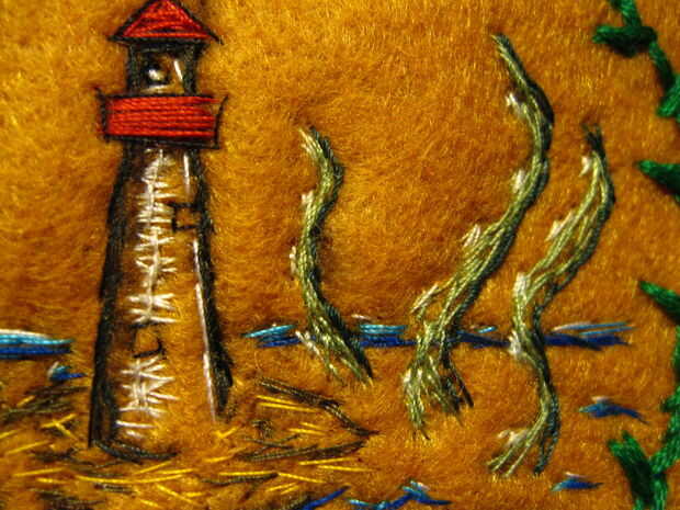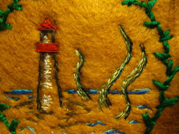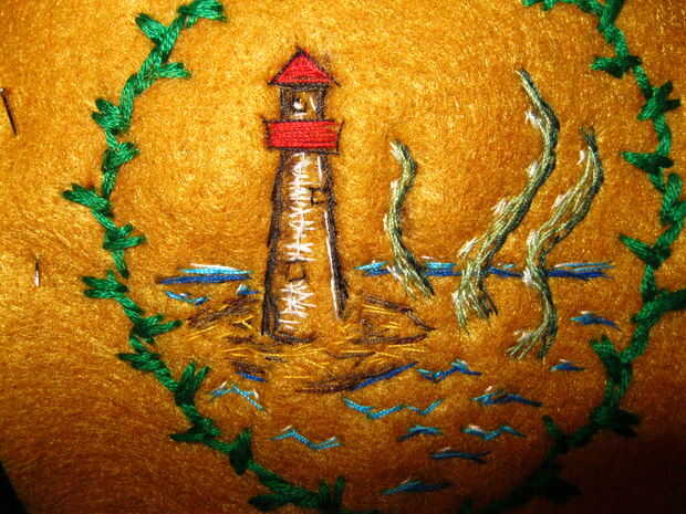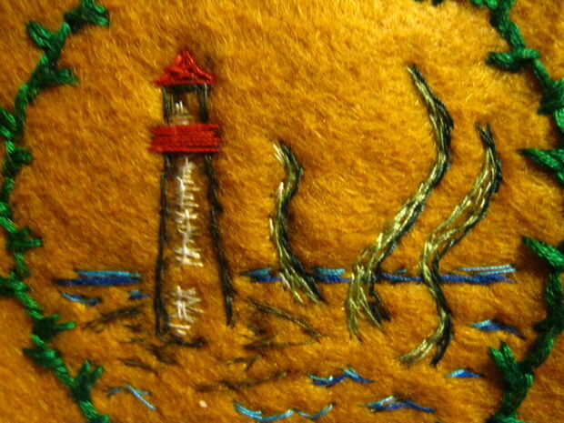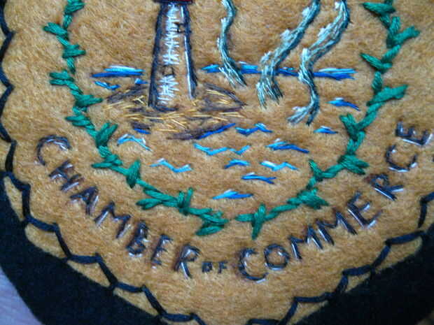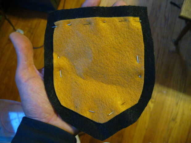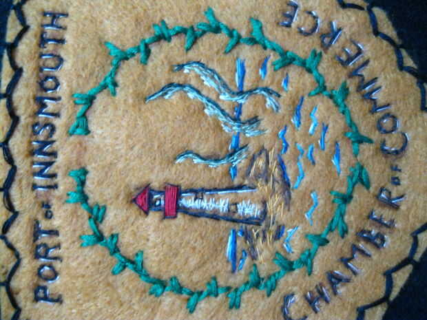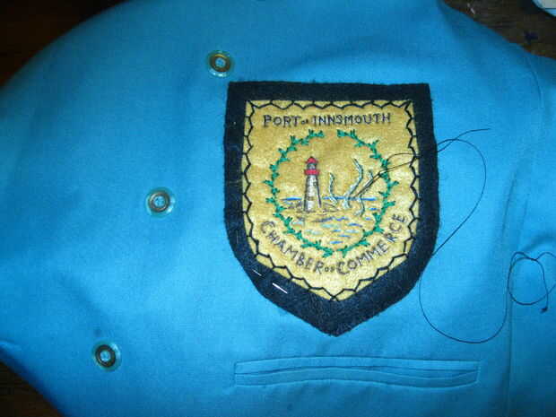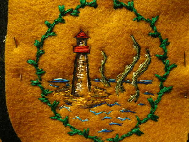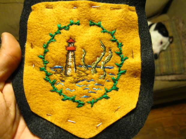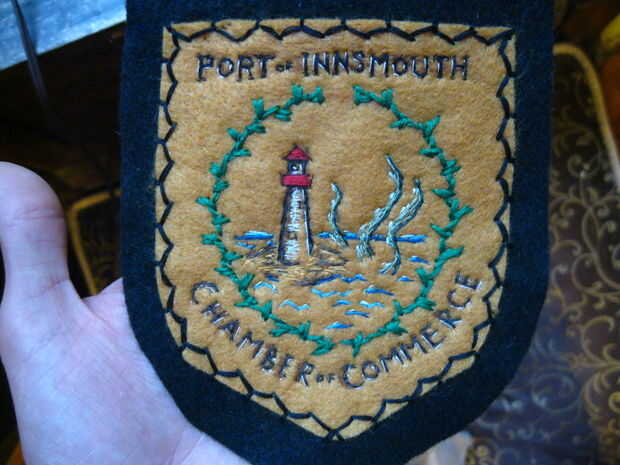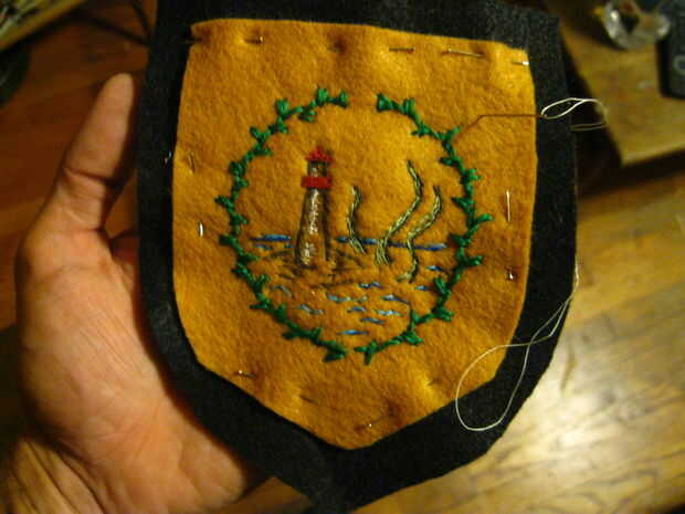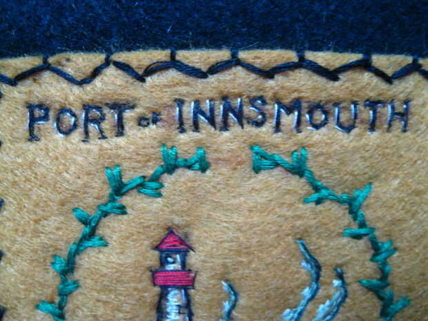Cortar el fieltro negro en forma de escudo y la vara de oro en un protector más pequeño y les capas. Entonces sólo surgió con una idea básica de una insignia de la ciudad - un promontorio con un faro en el mar y enormes tentáculos levantándose fuera del agua. Mano bordada la insignia, con las palabras puerto de INNSMOUTH en la parte superior y la cámara de comercio de la parte inferior.