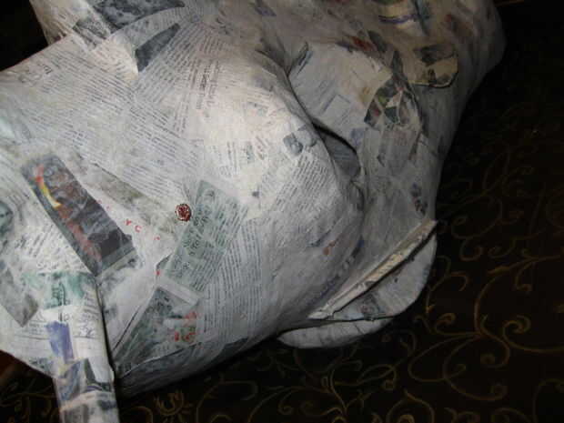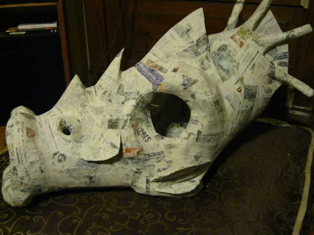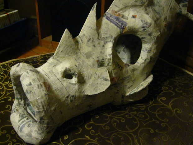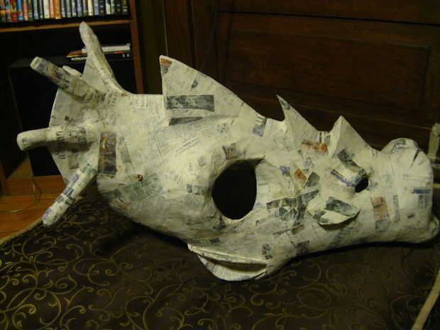 El proceso, como siempre, es realmente sencillo. Arrancar las tiras del periódico. Batir algunos harina y agua para hacer una pasta. Uso de esta pasta para pegar las tiras de periódico a la superficie de la máscara y cuando seca, forma una cáscara dura.