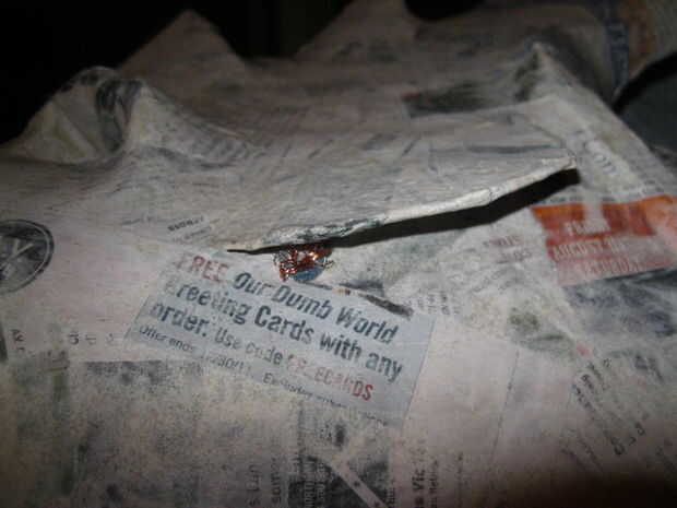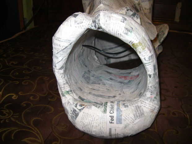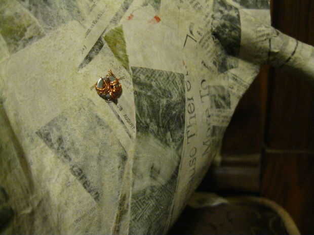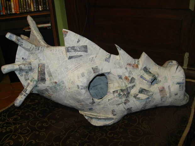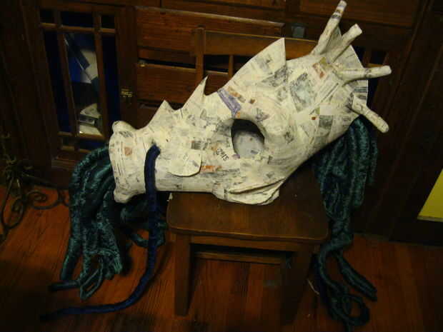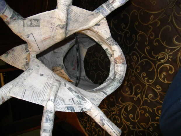 Anticipando la necesidad de fijar los tentáculos más tarde, también encadenado un trozo de alambre en cada extremo, varias pulgadas dentro de las aberturas para la boca y la parte superior de la cabeza. Se tiraron a través hacia el exterior, donde envuelto la tierras de los alambres una arandela para sujetar en su lugar. Ellos también fueron fijadas con pegamento caliente, entonces la piel de papel maché se extendió sobre ellos.