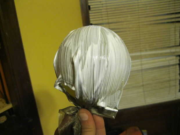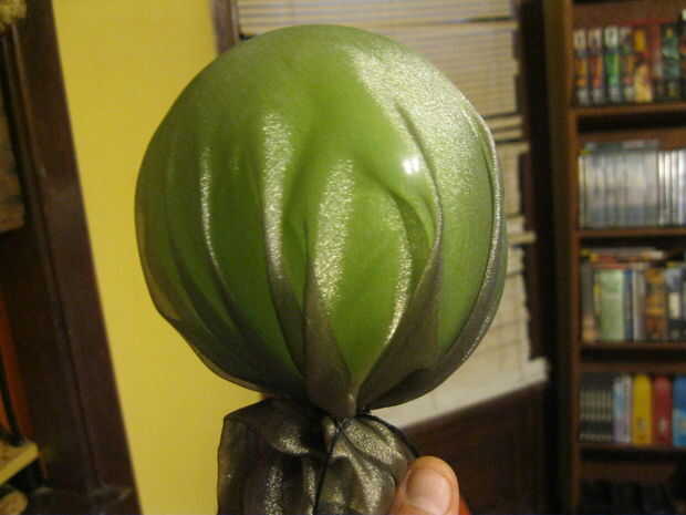 Infla un par de globos de pequeño grupo. Envuelto con una capa de Tejido voile y había cepillado en con una capa gruesa de barniz acrílico, luego colgado a secar. Repetí el proceso con dos capas de tela. El resultado fue una algo débil, pero firme, semi-translúcida forma bulbosa.