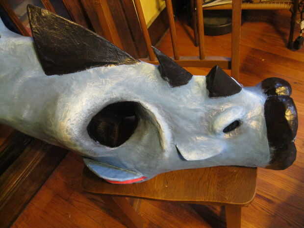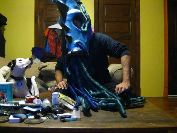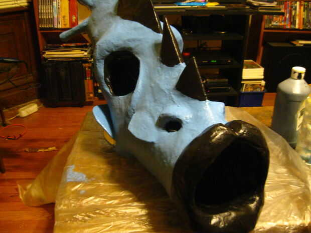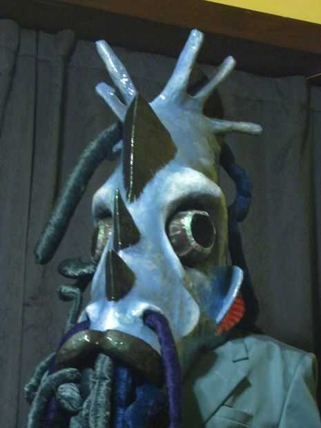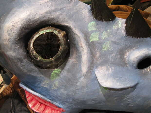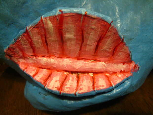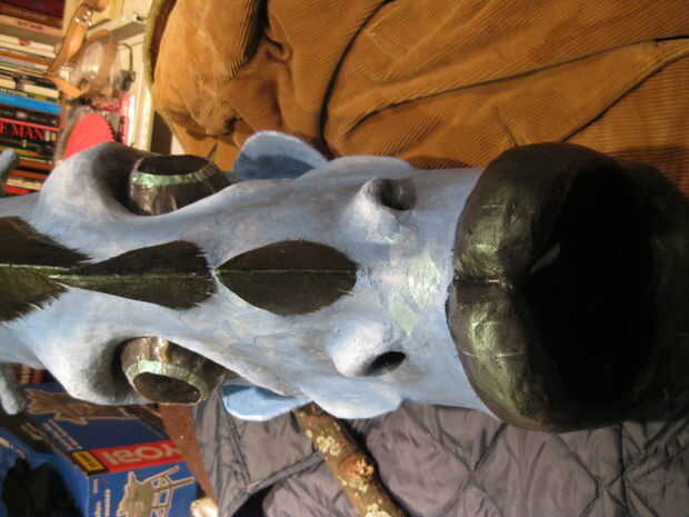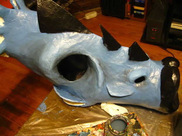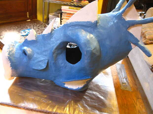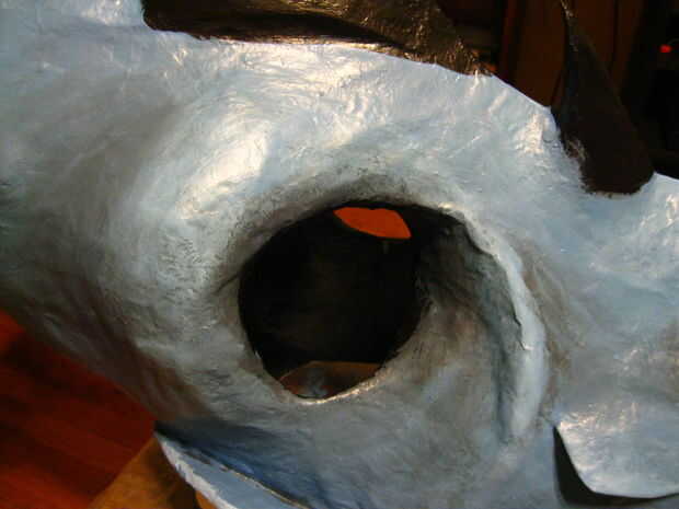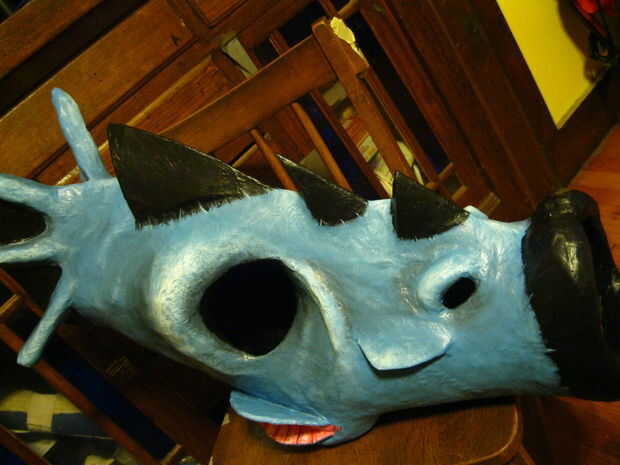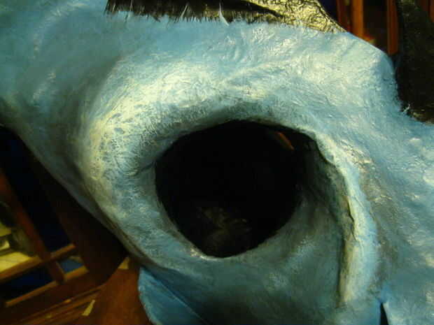 El truco principal aquí fue dejar la superficie desigual de la piel guía de la pintura. Después de una base sólida, es teñida de azul con distintas cantidades de blanco o negro para añadir contorno y textura a las diferentes áreas de la máscara, hacer el esculpido cejas y fosas nasales y las branquias muy pop. Con un áspero superficie como esta máscara tiene, usted puede cepillar colores en ligeramente sin embalaje en todos los rincones y grietas, dando por resultado un multi-tono mira que es raro y algo más realista. Otra técnica es poner el color en grueso, luego use un paño húmedo o una esponja para limpiar suavemente la capa superior, dejando el nuevo color sólo en los rincones y grietas. Utilizo pinturas acrílicas que son fáciles de limpiar, así que usted puede disfrutar de cierta experimentación y ensayo y error.