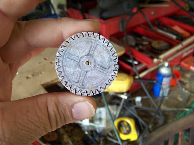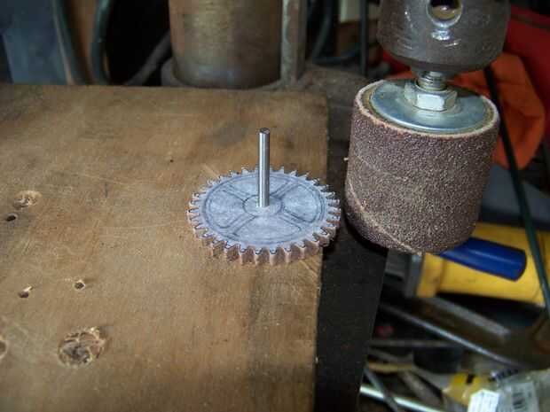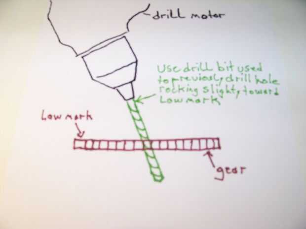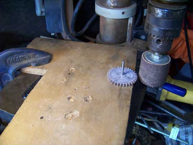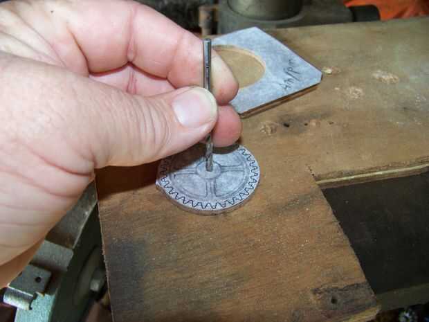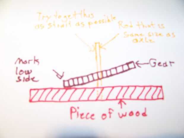Conseguir el agujero derecho comienza con la puesta a la mesa de la drillpress y sostiene una pieza de madera plana que pueda sobre la mesa, luego que perforar un agujero del mismo tamaño como el árbol, hacer todo lo que pueda para conseguir este agujero recto, entonces presiono el árbol en el hoyo, poner el engranaje en el eje con la parte baja de la marcha apenas tocar la madera , girar el engranaje con el árbol restante todavía para asegurarse de que he encontrado del lado de baja y haga una marca, redrill el agujero ligeramente oscilante la broca hacia la marca del lado de baja, una vez que me siento como el engranaje es de 90 grados del eje pegue.