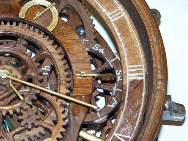 Sincronicidad es un reloj de pared de péndulo único engranaje de madera expuesta, con una combinación de la vieja y nueva tecnología.Muchos relojes de engranaje de madera son conducidos por pesos. Estos relojes necesitan ser herida periódicamente, ta