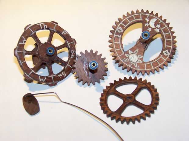 Después de todos los engranajes que necesita para ser un reloj, me di cuenta que había mucho espacio vacío todavía a la izquierda dentro del tambor del banjo, quería algún tipo de simetría para el tren de engranajes, así que hice un conjunto de engranajes que mostrar am/pm y los días de la semana, también pensé que sería cool tener un reloj de engranajes de madera con estas dos opciones extras. Y todo por el tren de la línea.
