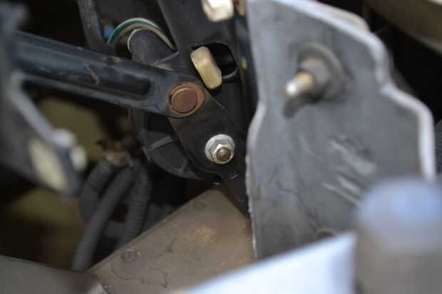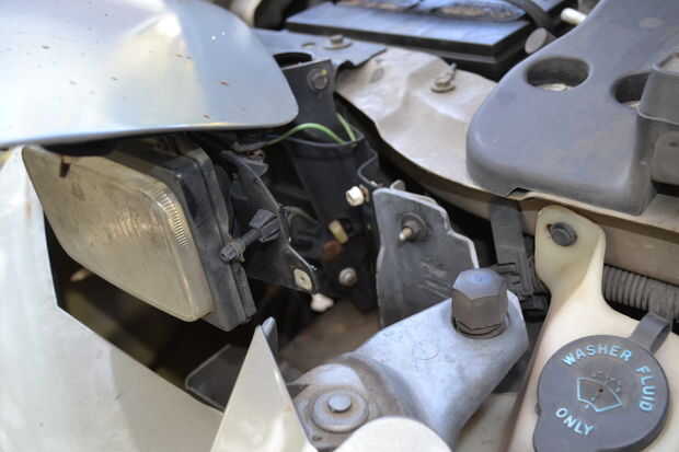 3. Retire el brazo de Faro (1 tuerca). Antes de comenzar, tómese un momento para investigar y entender cómo funciona el mecanismo del faro. En círculos de la ingeniería, llamamos a esto un 4 barra de acoplamiento. La tuerca que sujeta el brazo en su lugar es un tamaño de 10 mm. Incluso después de retirar el acoplamiento probablemente será difícil de quitar. Te recomiendo encontrar una "palanca de persuasión masiva" para ayudar. Pero ten cuidado. El acoplamiento es lo único que sostenía la luz para que se caiga a menos que tenga algo más para sostenerlo para arriba.