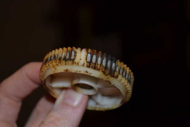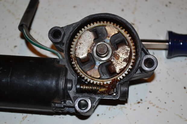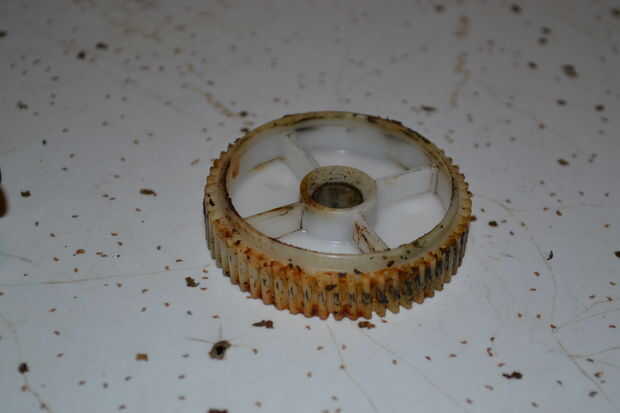 Y como se puede ver en las imágenes de abajo, después de 15 años de conducir dos dientes finalmente esquilada apagado el engranaje interior. Nunca nada va mal con el resto del motor. Un motor entero puede costar tanto como $270. Impresión a un costo de engranaje de nylon $1-3 dependiendo de cuantas copias hacen.