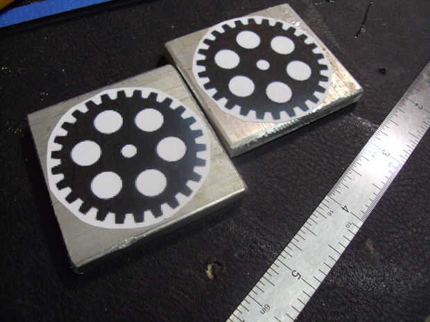Como la elección de los engranajes de latón, un diseño adecuado, buscar en la web. Elegí una más fácil, con sólo circulare agujero, porque estaba usando aluminio (a ver si me ha gustado mucho mejor que el latón uno) y usando un método de corte diferente que mis engranajes anteriores. Foto de la tienda el engranaje para el tamaño que desee, usé poco menos de 2 pulgadas. #1 porque la culata de aluminio tenía era 2x.25 ". #2 y escondieron la forma de cresta. Imprima en papel de la etiqueta del"" y aplicarlo a su material. ¿He utilizado la clase "reutilizable"? No sé... su dice reutilizable. El patern de engranaje está ahora en su stock y listo para el corte.