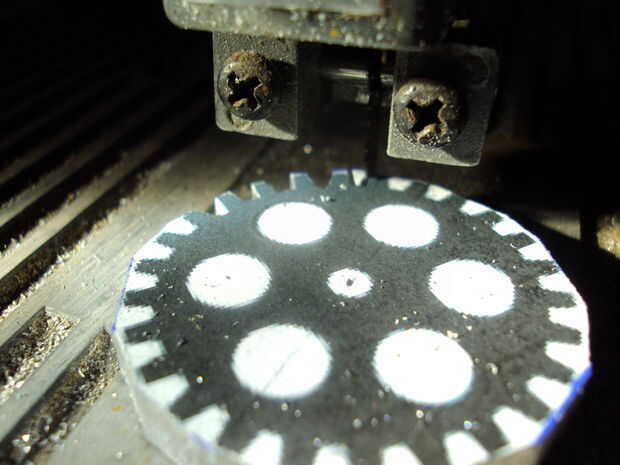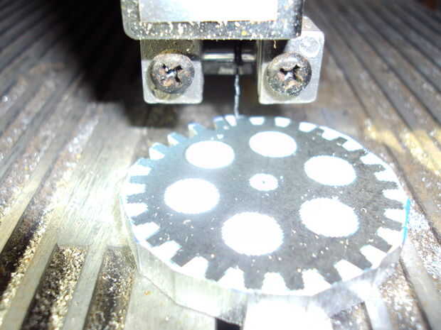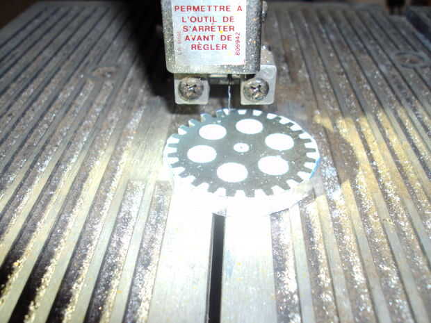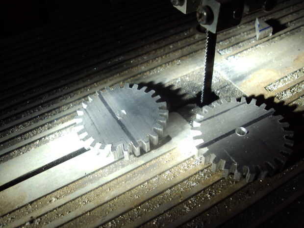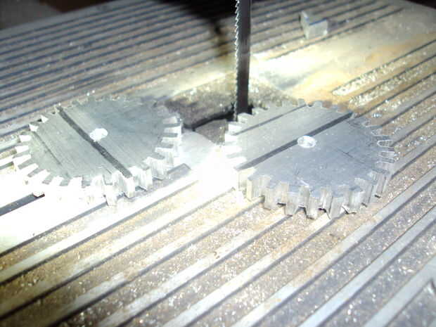 yo llamo a esto "el juego del hombre con demasiados dedos consejos jejeje.  Corte dos veces por cada diente y que use la sierra para quitar los restos del pequeño triángulo compran afilar el ángulo de corte ligeramente para quitar el trocito. Tomó cerca de 30-35 minutos para hacer los engranajes dentados fuera de mi stock cuadrado. Mucho más rápido que la mano presentó versiones anteriormente mencionadas.